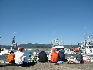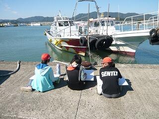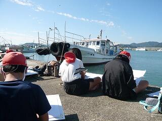 岸壁には、漁船が何隻もつながれていて、6年生は、その船を中心にした絵をスケッチしました。船体を斜め前から見て力強く描いたり、船に装備されている様々な機器や道具を細かく描いたりと、集中して取り組みました。