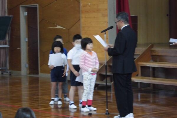 今朝は、11月の全校朝会を行いました。まず、「わんぱく相撲」、「校長室ギャラリー感謝状」、「町読書感想文コンクール」、「県文集ともだち作品掲載、氏名掲載、さし絵掲載」について表彰を行いました。その後、今月の保健目標「姿勢に気をつけよう」について話をしました。