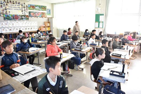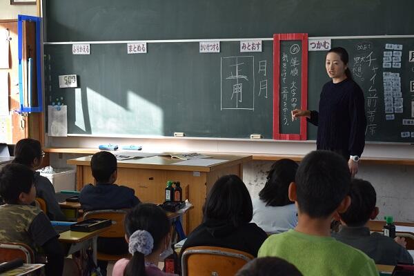 今日は、3年生が書写(習字)の学習に取り組んでいます。書き初めで「正月」という文字を書いていますが、ゲストティーチャーとして髙橋さんに来ていただいての学習に取り組んでいます。