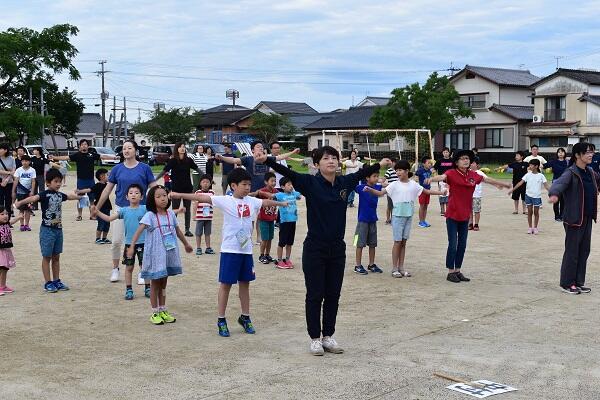 今朝は、町内一斉のラジオ体操を行いました。運動場に、児童・保護者・中学生・地域の方・学校職員が集まって行いました。