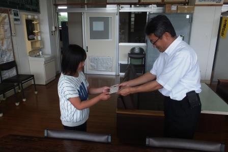 【校長先生から表彰を受ける莉花さん】