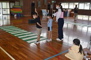 当初の計画では、運動場でダミー人形を使っての衝突実験等も行う予定でしたが、天気予報があまりよくなかったため、場所を体育館に変更し、内容も屋内メニューに変えました。