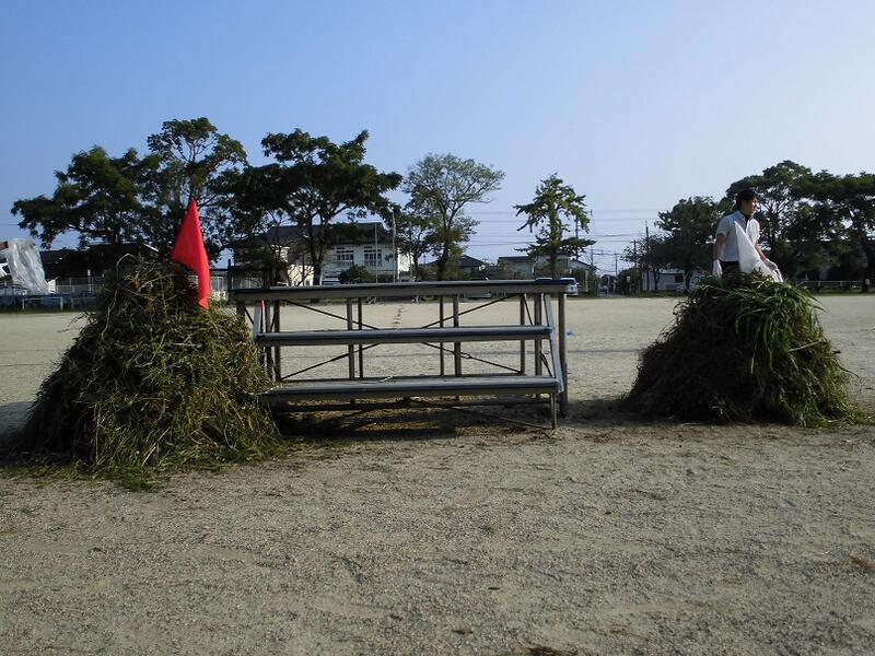 草川小学校は,夏の間にグラウンドにたくさん草が生えてしまいます。コースにも進入してきてしまうほど草が生えるのですが,それを毎年,保護者の方々にもお手伝いいただいて,運動会前の奉仕作業できれいに整備しています。