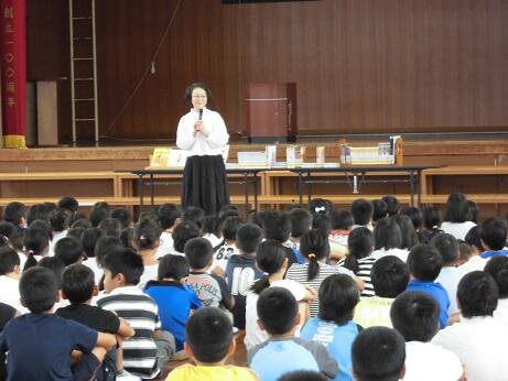 まず,校長先生から平木文庫についての紹介がありました。平木文庫がどのようなものか,子どもたちは真剣に話を聞きながら理解することができたようです。次に,児童代表挨拶として,平木様に対する感謝の気持ちを発表しました。最後に,平木様から子どもたちにお言葉をいただきました。「みなさんが喜んでくれて,わたしたち夫婦も嬉しいですよ。これからもたくさん本を読んで下さいね。」と温かな言葉をかけていただきました。