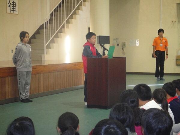今朝は、10月の全校朝会を行いました。校長先生から、9月の集団登校で「挨拶」「一列歩行」などが上手だった班を表彰していただきました。表彰された班は、