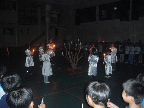 「行縢山登山」「キャンドルのつどい」「追跡ハイキング」「むかばきレコード」(長縄飛びチャレンジ)などの活動に取り組みました。「規律」「協同」「友愛」「奉仕」の心や態度を学ぶことが学習の中心でした。