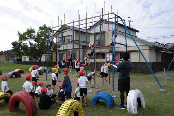 台風が過ぎてから良い天気が続いています。今日の1年生の体育は、よい天気のもと、外で遊具を使った運動をしました。気持ちよさそうに、体を動かしていました。
