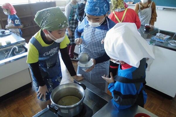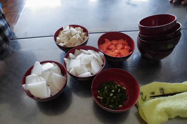今日は、5年生が調理実習をしました。味噌汁作りの実習で、具は「豆腐」「大根」「にんじん」「ねき」でした。