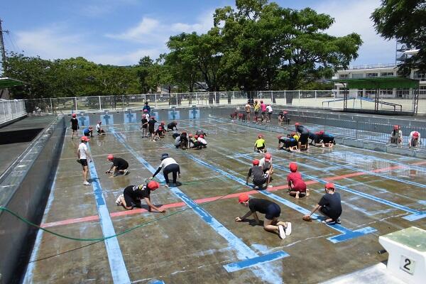 6年生が全員で一生懸命にプール内の床や壁を磨いてくれました。