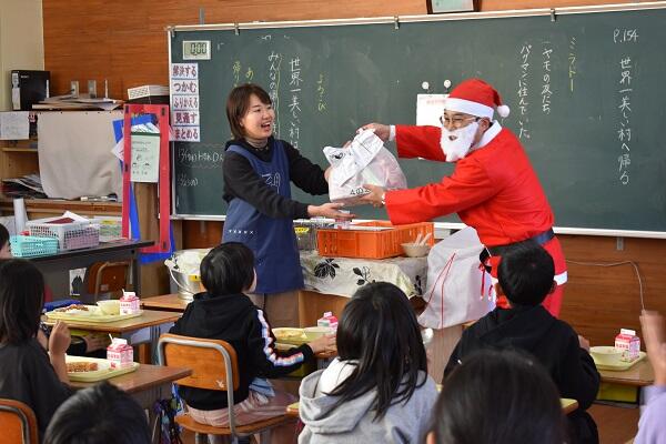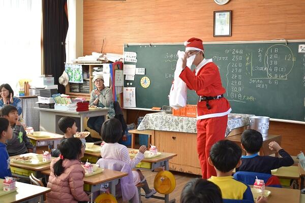 そのケーキを教室に届けるのに、サンタさんがやってきました。