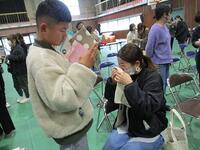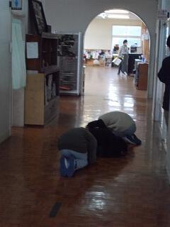 休み時間とあって、最初は騒がしい中で放送を聞きましたが、子どもたちはすぐに気持ちを切り替えて、机の下にもぐったり、安全な場所で低い姿勢をとったりしていました。