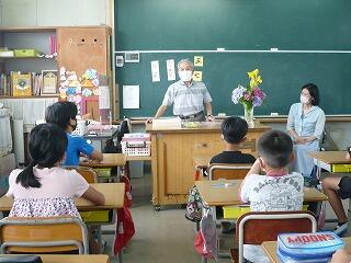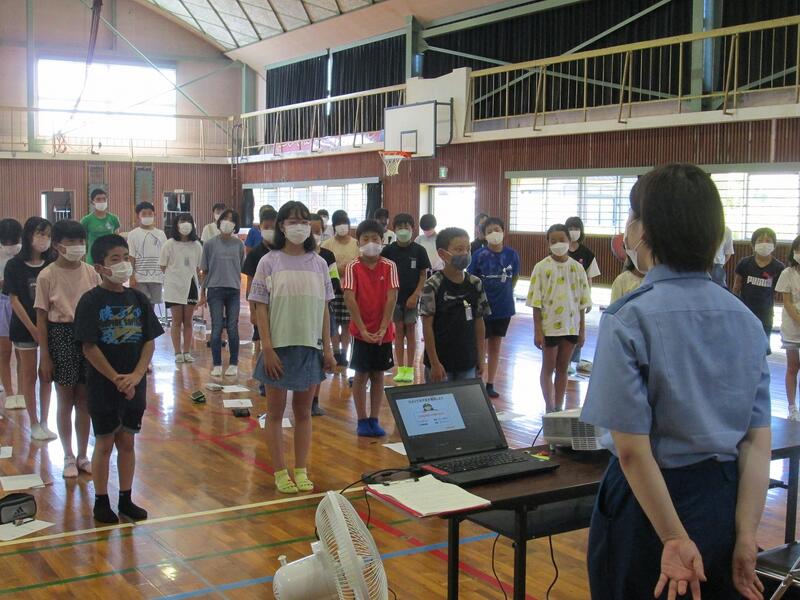 19日(火)門川中学校の生徒会の皆さんによる、夏休み過ごし方についての話がありました。生徒会の皆さんは、自分の出身校に行き、中学生、小学生共に安全で楽しい夏休みを過ごしたいと話をしに来てくれました。