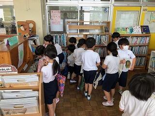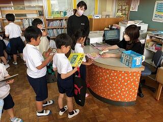 平仮名の読み書きも少しずつ慣れてきた1年生。学校図書館の前の廊下を通ると、1年生が借りていた本を返しに来ていて、全員がまた新しい本を2冊ずつ借りていました。