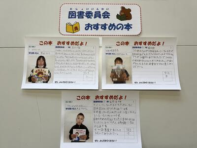 昨日の給食時間に図書委員会の児童3名が低・中・高学年の人におすすめの本を紹介してくれました。