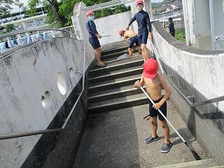運動場で練習をしていた草川ファイターズの子どもたちも、真剣に階段を上がってきました。