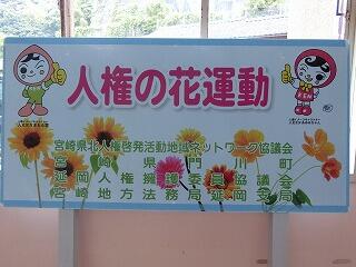 宮崎地方法務局延岡支局の皆さんの他、町長さん、教育長さん、門川町人権擁護委員の皆さんをお迎えして、花や看板の贈呈式を行いました。