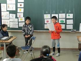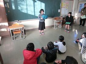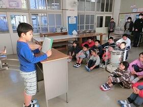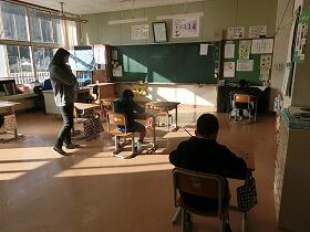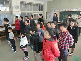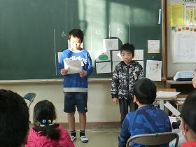 ただ、1時間目の始業式を、あまりに体育館が寒かったので、少人数のよさを生かして、ストーブのあるわくわく教室で行いました。3年生と5年生が、児童代表の作文を発表しました。3年生は、作文や漢字等、たくさんのがんばりたいことを発表してくれました。新年に向けて張り切っている気持ちがとてもよく伝わりました。5年生は、あいさつを相手よりも先にするという具体的な目標を立てていました。また、来年度に向けて、今年の素晴らしい6年生を手本にして、がんばりたいという最高学年を意識した立派な発表でした。