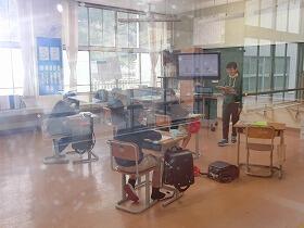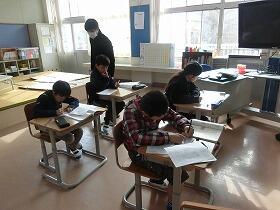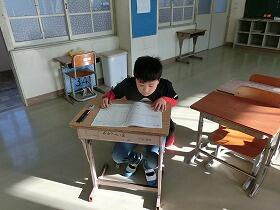 下の写真は、学年ごとに分かれてテストに取り組んでいる子どもたちの様子です。少人数なので、広い教室に思いっきり広がってがんばっていました。カンニングなんて絶対不可能です。