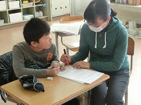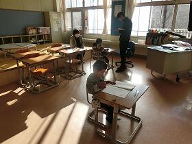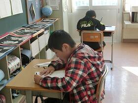 本校の子どもたちは、いつも先生方と一生懸命に授業に取り組んでいます。1年生は、生活科の学習をしていました。昨日行った冬探しでみつけた冬の様子をカードに一生懸命まとめていました。2人が黙々と集中して取り組んでいる様子にただただ感心するばかりでした。3年生は理科の学習をしていました。これまでの学習を生かしたおもちゃづくりの計画をする学習でしたが、黒板が文字で埋め尽くされていて、子どもたちからたくさんの考えが出されたことが容易に分かりました。4年生は、国語の学習でした。先生と1対1で、発表会に向けたインタビューの内容を話し合っていました。1対1なので、当然集中力抜群でした。5年生も国語の学習でした。自分の所属している委員会活動をどうやって効果的に紹介するか、ワークシート使いながら一生懸命自分の考えを整理していました。さすが高学年という落ち着いた授業態度でした。6年生は、テストを行っていました。あまりの集中した様子にじゃまをすると悪いと感じたので、撮影はやめました。