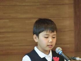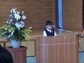 開会行事の教育長あいさつの後、子どもたちの発表が始まりました。本校の男児は4番目の発表でしたが、待っている間の緊張感がこちらにも伝わってくるようでした。しかし、私たちの心配もよそに実に堂々とした態度で、しっかりと自分の気持ちを会場の方々に伝えることができました。ふるさと西門川を愛するとともに誇りに思う気持ちが映像を見るように伝わり、練習で何回も聞いていたはずなのに、つい目頭が熱くなってしまいました。それほど聞く人を感動させる素晴らしい発表でした。
