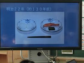 後半は、本校の給食に携わっていただいている草川小の栄養教諭である土井先生に給食の歴史についてお話をしていただきました。かすかに覚えている脱脂粉乳やくじらの肉が給食で出ていたお話は、とてもなつかしく思いました。結構くじらの肉は大好物だったイメージが残っています。途中戦争や援助の打ち切りで給食が中止された時期もありましたが、さまざまな方々のご尽力により学校給食法が制定され、現在の給食に至っていることも学ばせていただきました。