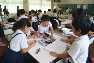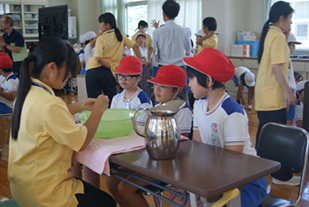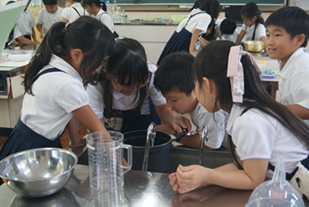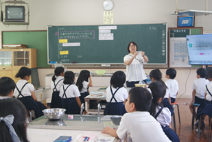 9月12日(金)に2年1組で算数の研究授業がありました。「かさ」の学習で、グループで協力して活動しました。1Lの水のかさ(量感)を相談しながら考えたり、いろいろな入れ物に水を入れてかさを測定したりしました。子ども達が生き生きと活動し、楽しく学習に取り組んでいました。