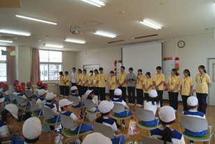 「中村学園大学の藤崎健吾と言います。10年前までは私も五十鈴っ子でした。思い出のつまったこの五十鈴小に来ることができてうれしく思います。みなさんとたくさんお話ができればと思います。1ヶ月間、よい時間が過ごせるよう、よろしくお願いします。」