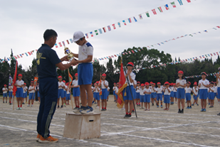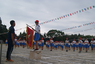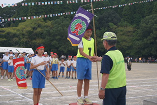 いよいよ団の色が決定したあと、校長先生から今年の団長へと団旗が渡されました。