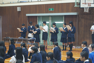 次に、3年生と4年生が「2学期にがんばりたいこと」について作文発表をしました。勉強や運動会、スポーツなどにがんばりたいと述べていて、とても意欲的な2人でした。