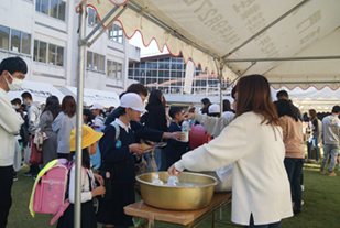 予約券を持って各ブースで買い求める方、当日券販売の列に並ぶ方、そして買った物を家族でおいしそうにいただいている方・・・。様々な姿が中庭の至る所で見られ、うれしく感じました。