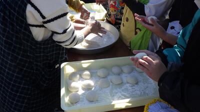 かまどでもち米を蒸す、うすときねでもちをつく、熱々のお餅をこねるという一連の作業に子どもたちはおうちの方々と一緒に楽しそうに取り組んでいました。砂糖醤油につけて、つきたてのおもちを2個、ペロリとたいらげていました。