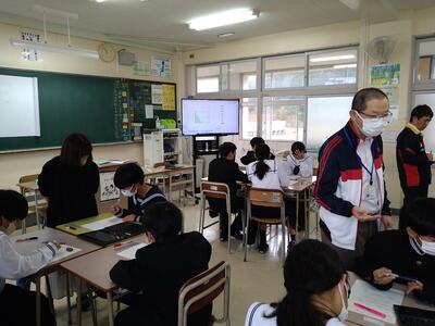 7年生の数学の一人一授業がありました。今回の授業は、「長方形の周を動く点を通じて、これまで学習した関数や方程式をもとに、問題解決力を向上する」という目標をもとに進めていきました。タブレットを班に1台準備し、グループ内での話し合い活動が活発になる様に工夫をしながら授業が進められました。問題を解決していく中での様々な気づきをグループ内で出し合い、分からないときには手を挙げてアドバイスを求めるなど意欲的に問題解決に取り組む様子が見られました。