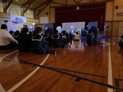 ミュージカルは、絵本でも有名な「あらしのよるに」です。ミュージカルを通して、人が人を思いやる気持ち、違ったもの同士が共に生きることの大切さを子どもたちに伝えてくださいました。歌声や体や物を使った表現が大変素晴らしく、お話の世界に引き込まれました。1時間半という上演時間が本当に短く感じました。