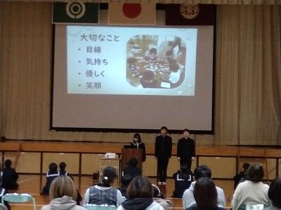 校長先生から、県内でのコロナウイルス感染症の罹患率は減少傾向であるが、インフルエンザウイルスの罹患率は上昇傾向であること、一つの感染症が治まりつつあると他の感染症が増えてくる現状もあることなどのお話がありました。日頃からの規則正しい生活と感染予防対策をしっかりしましょうとお話がありました。