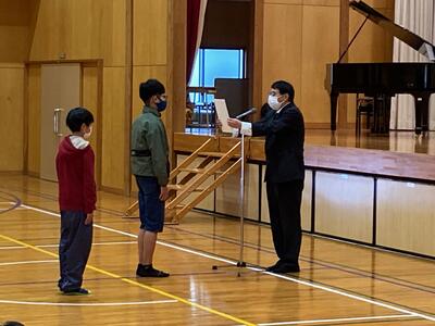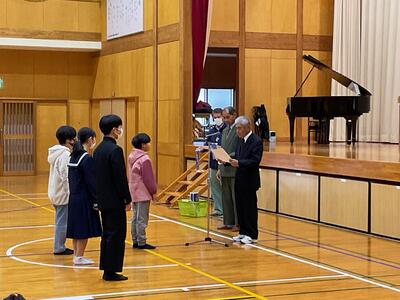 修了式では、各学年の代表の児童生徒に修了書が渡されました。その後、児童生徒を代表して、1・5・8年生の児童生徒が作文を発表しました。