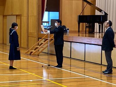 引き続き、新しく児童生徒会の役員になった5人に任命状が授与されました。これからの東郷学園の伝統を受け継ぎ、また新たな風を東郷学園に吹かせてくれるものと期待しています。
