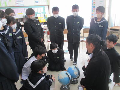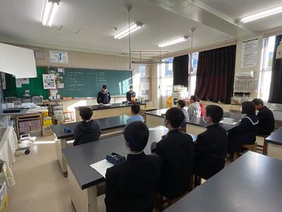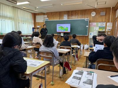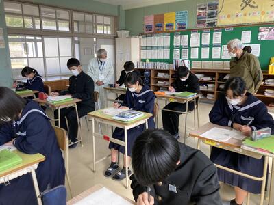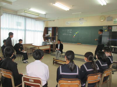 11月29日(水)、社会福祉協議会東郷支所の方々3名をお招きして7年生の総合的な学習の時間が行われました。7年生の総合的な学習では、日向市東郷地域振興計画の東郷地域の持続可能性を高める7つの方針をもとに、3つのグループにわかれて福祉の視点からそれぞれのグループで東郷町を考える学習を進めてきました。