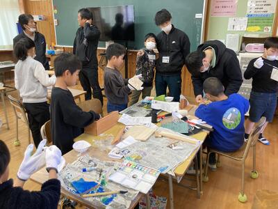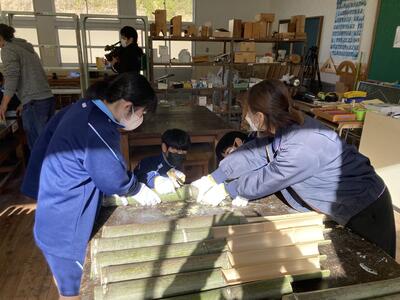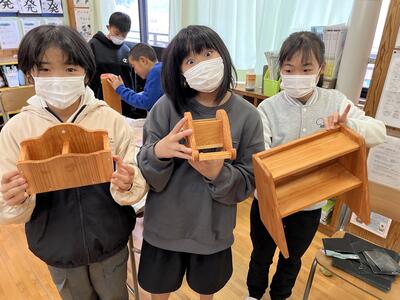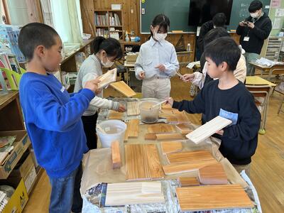 まずは、耳川広域森林組合の方から、森林の役割とその大切さ、林業の役割についての説明がありました。その後、小物入れやスマホ立て、ペン立てづくりなど、子どもたち一人一人が作りたいものを作りました。しっかりと固定できるように釘を慎重に打ち込んだり、お気に入りの色を木材に丁寧に塗ったりするなど、木材とふれあいながらそのよさを感じるよい機会となりました。