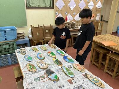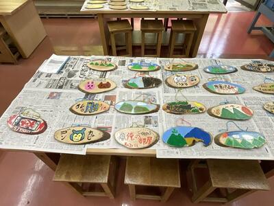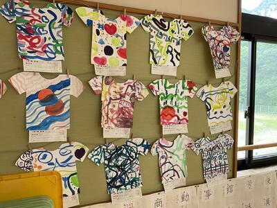 写真は3年生の図工の作品です。絵の具や絵筆の使い方の学習の中で、自分だけのオリジナルTシャツをデザインしたものです。どれもすてきですよね。実物があったら着てみたいです。