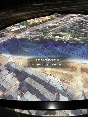 資料館に入るとすぐ、原爆が落とされる瞬間を空から映した映像が流れていました。「すべてはここから始まった」と、見学者に語りかけているようでした。