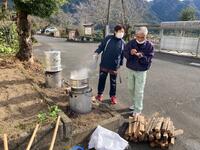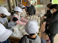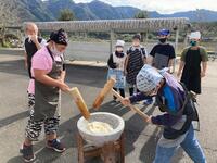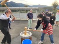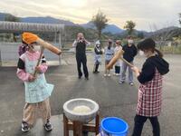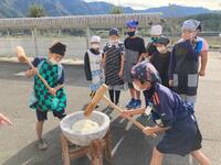 5年生は、親子でもちつきをしました。かまどでもち米を蒸すこと40分、ほかほかに蒸し上がったもち米を、きねと石うすを使ってもちつきしました。5年生の子どもたちも、保護者の方も力いっぱいつきをしました。つきあがったもちを子どもたちと保護者の方で丸めました。子どもたちも保護者の方もがんばったので、とても美味しいもちができあがりました。つきたてのお餅はとても美味しかったです。