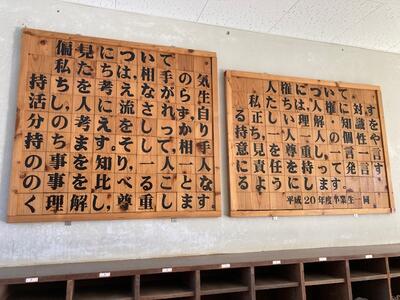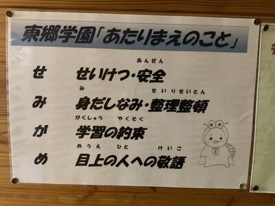 人権問題の1つにいじめ問題が挙げられます。そのいじめ問題に対して、東郷学園には、「東郷中いじめ撲滅宣言」が児童生徒玄関に掲示されています。この掲示は、平成20年度の東郷中学校の卒業生が記念品として残したものです。明日の児童生徒集会では、このいじめ撲滅宣言を全校児童生徒で読み上げます。