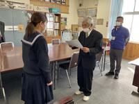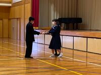 3月14日(火)に児童生徒集会がありました。はじめに、読書感想文で県の代表に選ばれて入選した9年生徒と、小学校陸上記録会のソフトボール投げの種目で県標準記録に到達できた6年児童が表彰されました。おめでとうございます。