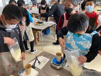 この体験学習では2つの軟膏を作りました。1つはカモミールを使った軟膏で、ハンドクリームとして使えます。もう1つはムラサキを使った軟膏で傷薬として使えます。どちらも油を140度まで熱し、その後「チューリ(種脂)」や「蜜蝋」を加えました。さらに色々と加えてから冷ますとでき上がります。子どもたちは、材料を電子天秤でしっかりと量ったり、油の温度を140度でキープできるように調節したりと、楽しみながらも真剣に取り組んでいました。苦労してできあがった軟膏を見ながら、とても喜んでいました。