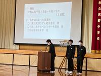 8年生は、社会体験学習で学んだことを発表しました。8年生は、9月13日(火)から15日(木)まで、「天領うどん財光寺店様」「ベルフォート日向様」「日向市消防本部様」の方々の協力をいただきながら、職場で働くという貴重な体験をさせていただきました。今回、それぞれが課題をもって取り組み、発見したことや学んだことを発表しました。オープニングの映像で流れた8年生のがんばる姿や、昨年度はコロナ禍で開催できなかった9年生が真剣に発表を聞いている姿がとても印象的でした。