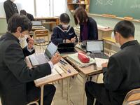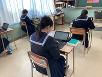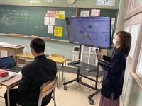 今回の授業では、クラスメイトや先生の3ヒントクイズを英文で作る学習を通して、関係代名詞の活用方法について学びを深めていました。その際、タブレットとティームスのアプリを活用して、エクセルのシート上に全員で書き込んだり、教師がアドバイスを書き込んだりしました。お互いの書き込んだことがリアルタイムで確認できるなど、ICTをうまく活用した授業でした。