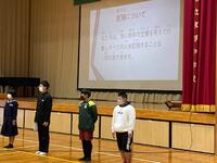 次に校長先生が、3学期に向けて特にがんばってほしいことを2つ話されました。「1つはあいさつです。校内だけでなく、地区でも大きな声であいさつできるようにしていきましょう。もう1つは勉強です。3学期は約50日という短い期間になります。自分の苦手な所を分析し、積み残しがないようにして次の学年に進級できるようにしましょう。」どの学年の児童生徒もこの2つのことにしっかりと取り組んでいきたいです。