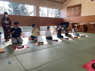 次にお茶の点れ方、お茶の飲み方を教わりました。お茶の作法から一期一会の考え方、相手をもてなす気持ちの大切さが分かりました。用意してくださった和菓子や、自分で点てたお茶はとてもおいしかったです。子どもたちの笑顔がとても輝いていました。