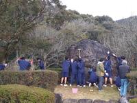 植栽を終えた後、西城公園に向かいました。山陰百姓一揆のスタート地点である西城公園にある逃散三百年記念碑の清掃を行いました。寒いなか、たわしやブラシを手にしながら一生懸命記念碑を磨きました。水をかけて落ちた汚れを見て、「すげー!」「きれいになった!」と歓声を上げながら頑張りました。清掃後には、東郷まちづくり協議会の鈴野会長をはじめ協力していただいた方々にみんなでお礼を言いました。帰る前には、西城公園から見える学校や耳川、街並みの美しさに感動しながら公園を後にしました。