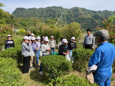 はじめに、地域コーディネーターの方から茶摘みの仕方を習いました。それからお茶の葉の先端にある芯芽と、その下の2~3枚の葉を摘みました。摘んだ生葉は地域コーディネーターの方に加工工場に運んでもらいました。加工した後は、自分たちでお茶を入れて飲む予定です。